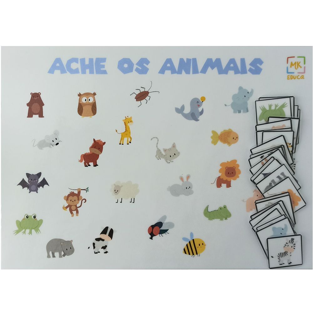 O jogo vem com 1 folha principal e 25 mini fichas com a imagem dos animais que estão distribuídos na folha principal. O objetivo é a criança localizar cada animal das fichas na folha principal.